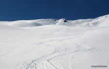 Aufstieg auf hart gefrorenem Schnee. Die Oberfläche ist griffig. Erste Abfahrt vom Stellenen. Der Südosthang war um 11 Uhr bereits leicht aufgetaut, wunderbarer Sulzschnee.
