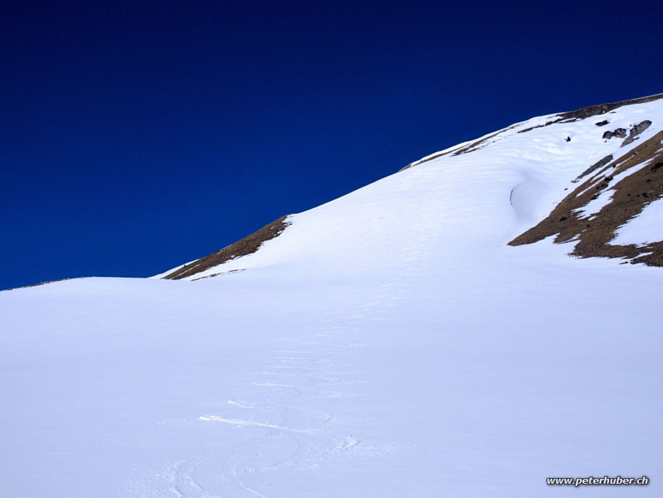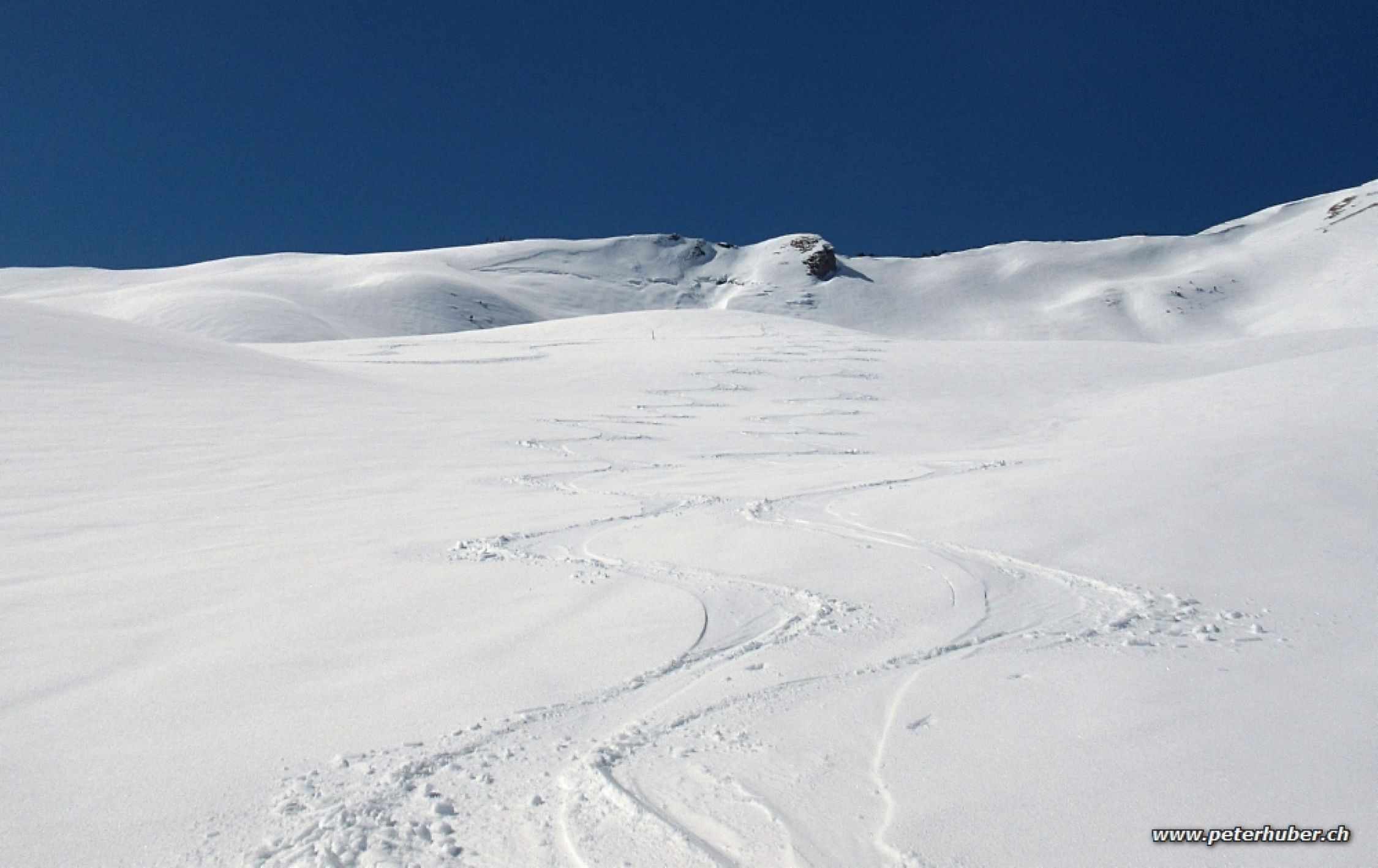 Zweite Abfahrt: Durch die Südostmulde hinunter zur Üsseri Alp nach 12 Uhr. Schon etwas mehr aufgesulzt. Sehr schön zu fahren da vor uns nur sehr wenige Spuren.