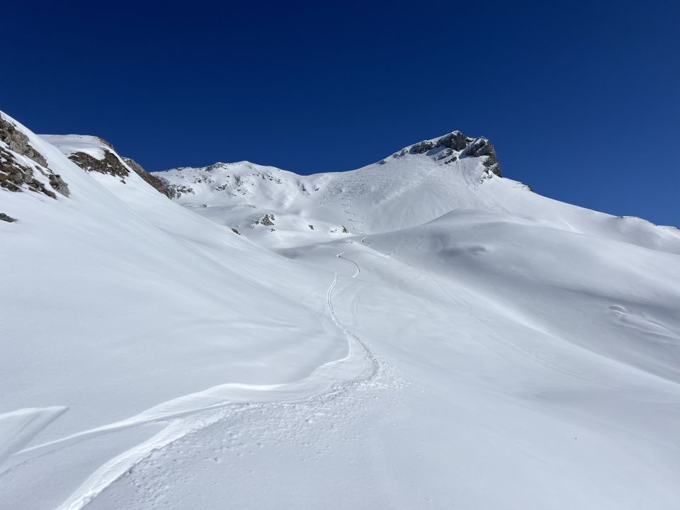 ABFAHRT: frischer Pulver auf harter Unterlage mit zunehmenden Deckel auf dem Weg zum Rupperslauiboden. Weiter guter Schnee in Schattenlagen im Rotenbalm, ab Chüestein tragender Deckel. Almweg ab Suterlis bis jetzt nur eine kurze Tragestelle bis oberhalb Hellberg.