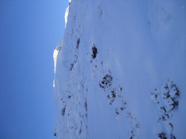 Pulver gut,aber noch etwas knapp mit Skis vorallem im unteren "ruppigen" und oberen abgeblasenen Teil.Mit Schneeschuhen war's eigentlich richtig gemühtlich!