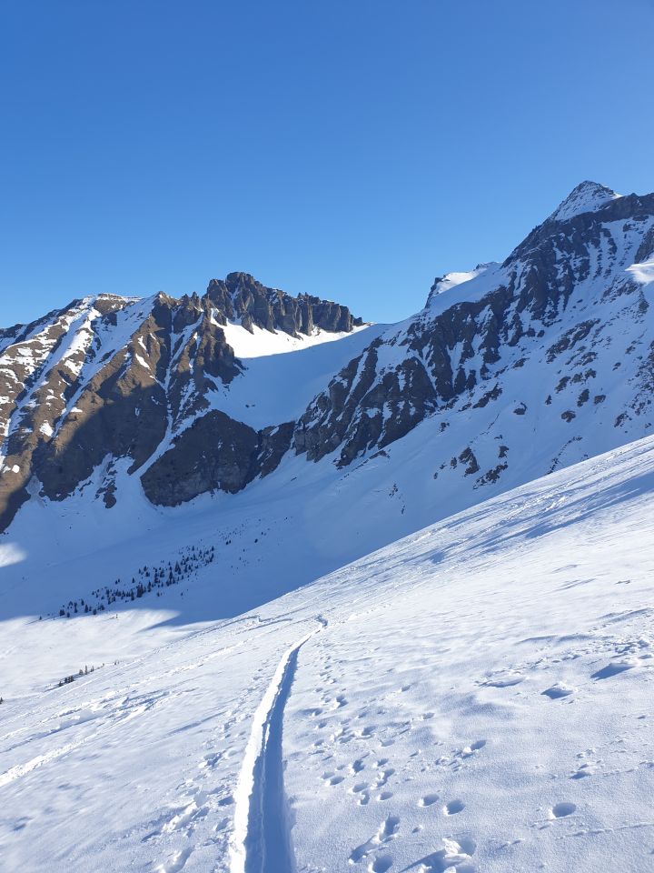 Schnee hats noch genug und noch lange! Schnee am Morgen im Talboden hart gefroren. In der Nordflanke vom Albristhorn die oberen 2/3 noch pulverig. Hatte sogar noch Platz für eine eigene Spur. Gegen den Talboden hin ein leichter Deckel. Aufstiegsspur den Biregrabe hoch sehr gut angelegt und angenehm zu laufen aufgrund des pulverigen Schnees. Harscheisen brauchte es heute nicht! Aufstieg zum Grat und Grat selber mit aufgebundenen Skis problemlos (Trittspuren). Danach ohne Probleme mit Skis auf den Gipfel.