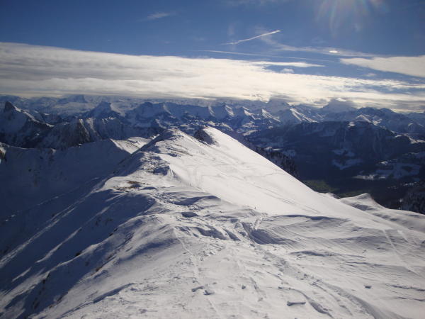 Wegen der starken Bise der vergangenen Tage verblasen. Die Schneequalität ist jedoch gut, im Gipfelbereich hat es sogar Sulz. Steinkontakt kann mit einer vorausschauenden Fahrweise problemlos vermieden werden.