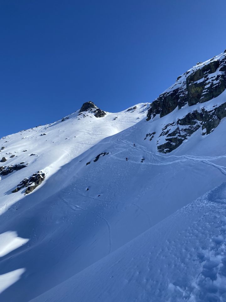 Aufstieg durch das Valzifenztal ab Parkplatz unproblematisch, Spur manchmal etwas vereist. Die Schneesituation ist insgesamt etwas besser als noch vor Wochen. Heute zu Josefi sind dann unter der Woche doch einige mehr Tourengeher unterwegs, bei strahlendem Sonnenschein und ohne ein Wölkchen. Abfahrt Nordhang wurde auch gemacht - Abfahrt durch die steile Rinne Richtung W zum Zeitpunkt meiner Abfahrt noch nicht. Weil die gestufen Hänge über den Normalweg schon beim Aufstieg verlockend unverspurt waren, habe ich mich für die bequeme Variante entschieden - sehr lohnend. Pulverschnee findet sich sonnenabgeneigten Hängen bis auf 2.100m darunter wird er leicht harschig. Südseitig versuchten es ein paar Tourgeher vom Schneeberg. Das schien um ca. 11:30 noch nicht aufzufirnen und die Spuren wirkten nicht nach Vergnügen.