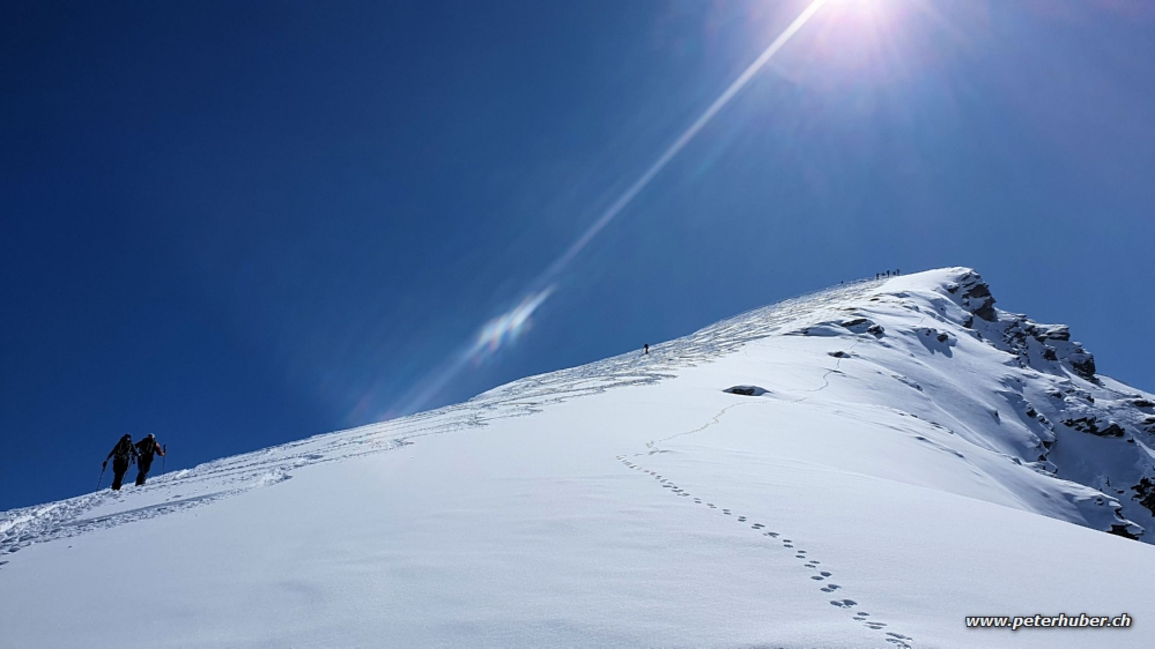 Strahlend schönes Wetter. Eher warm. Auf den Nordosthängen hat es genug Schnee, pulveriger Schnee. Auf der Sonnenseite etliche Grasflächen, aber Touren sind noch möglich, Sulzschnee.