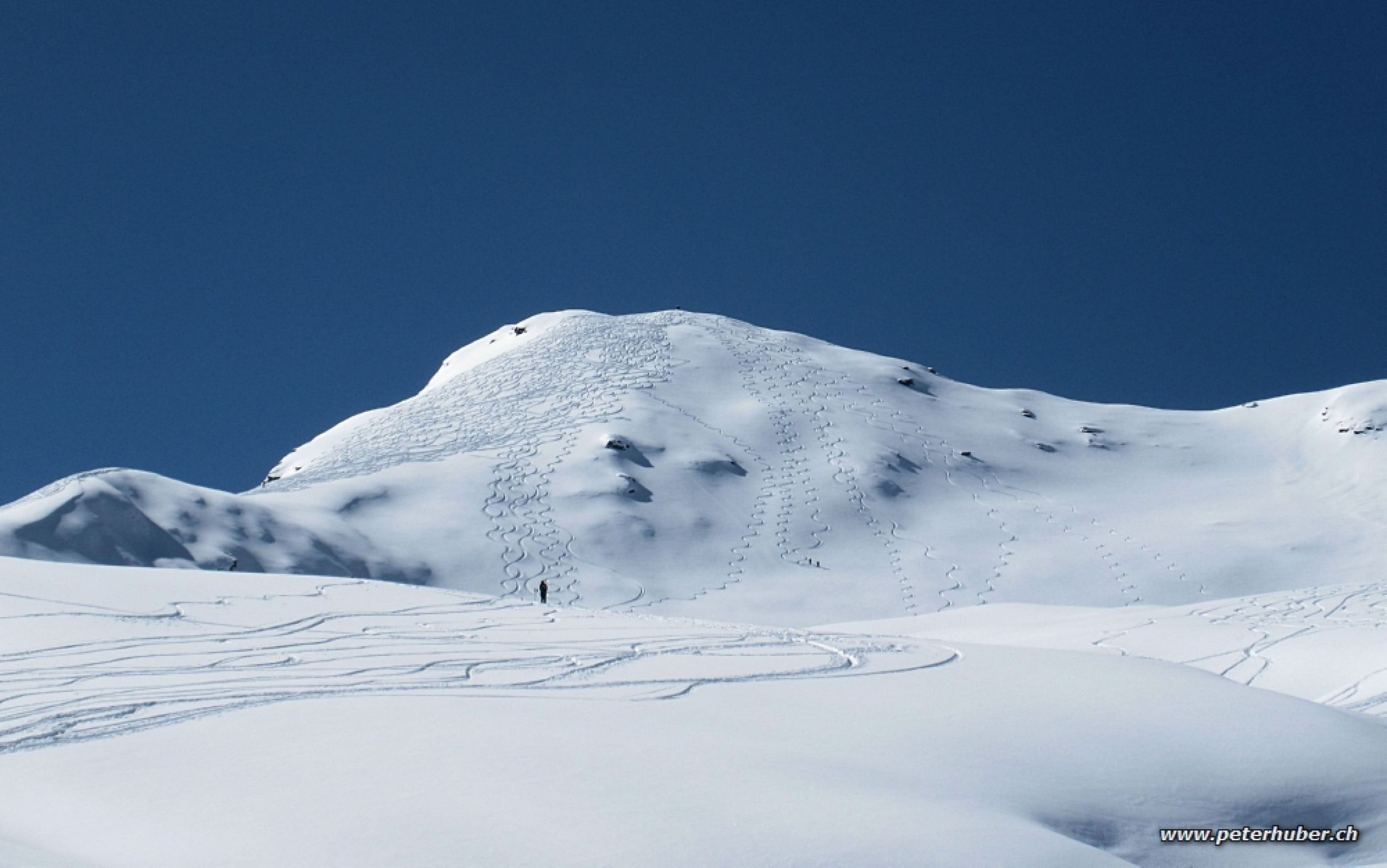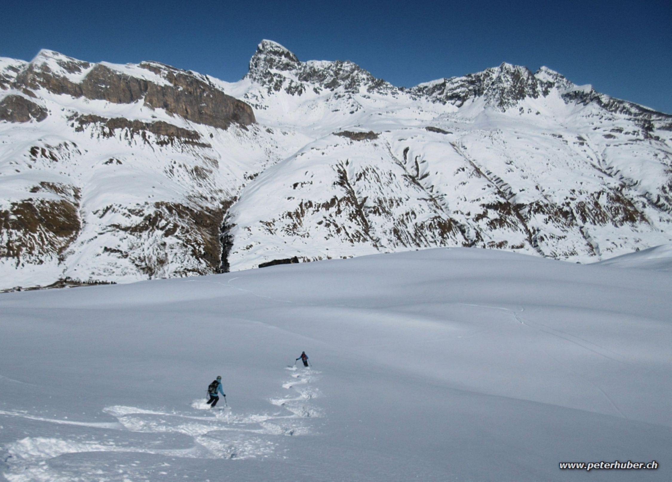 Zweiter Aufstieg auf Grosshora. Auch von dort oben schöner Pulverschnee zur Capettaalp hinunter. Ab zirka 2300 m leichter Deckel, aber immer noch gut zu fahren.