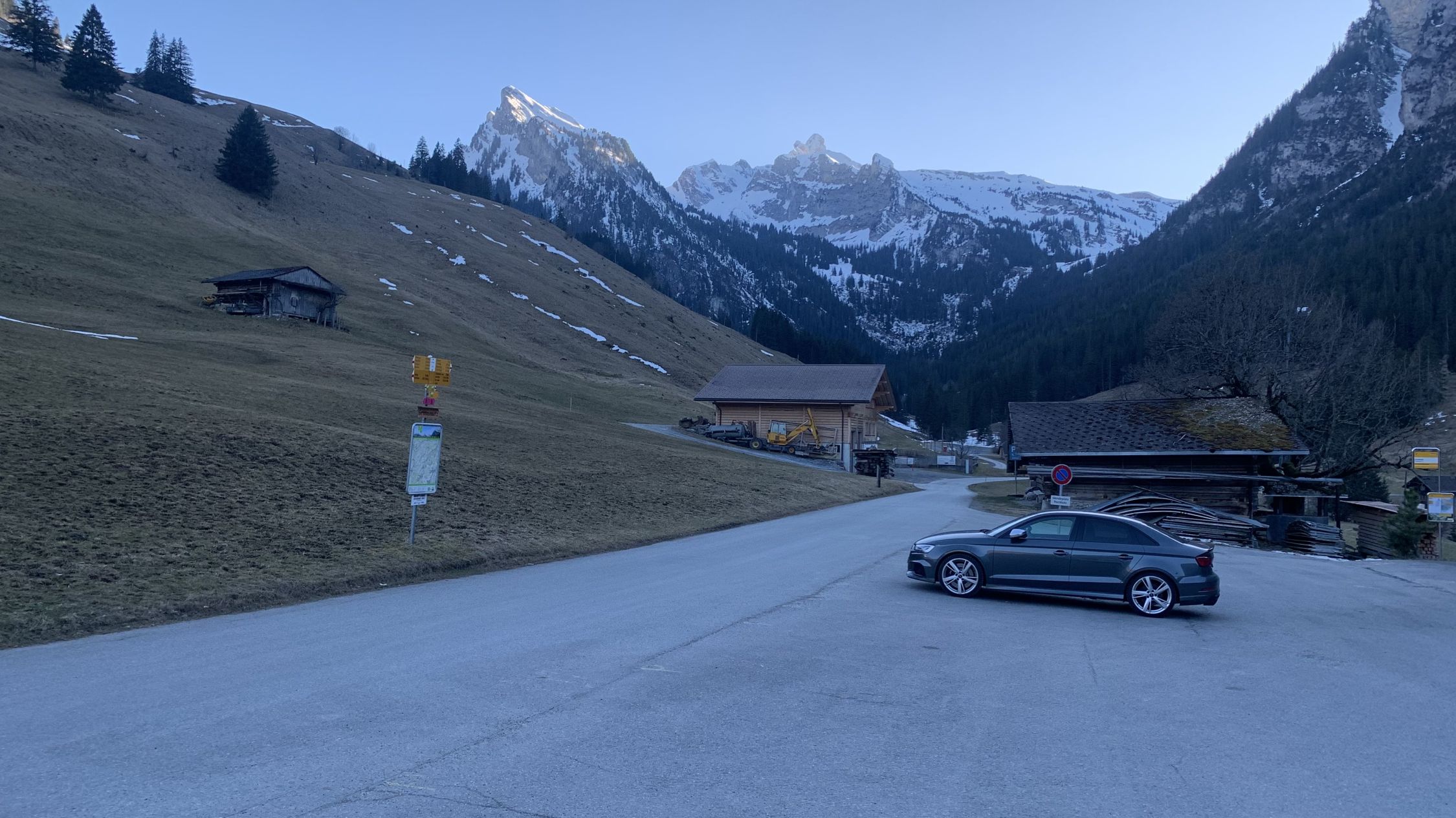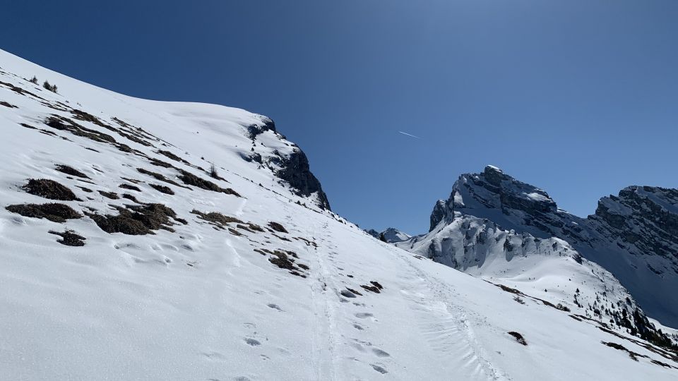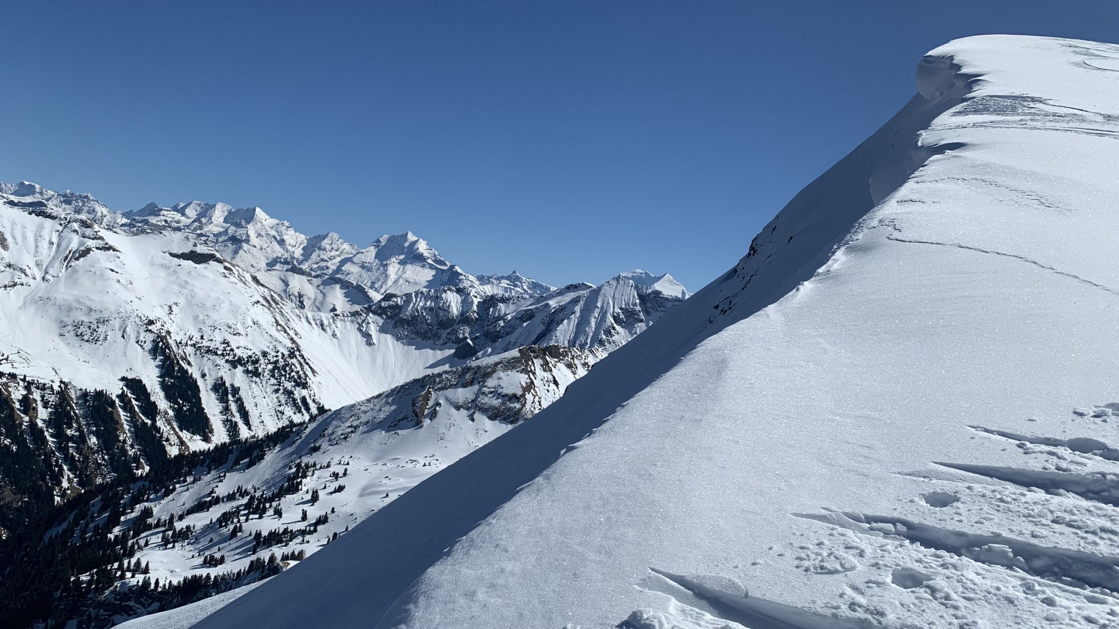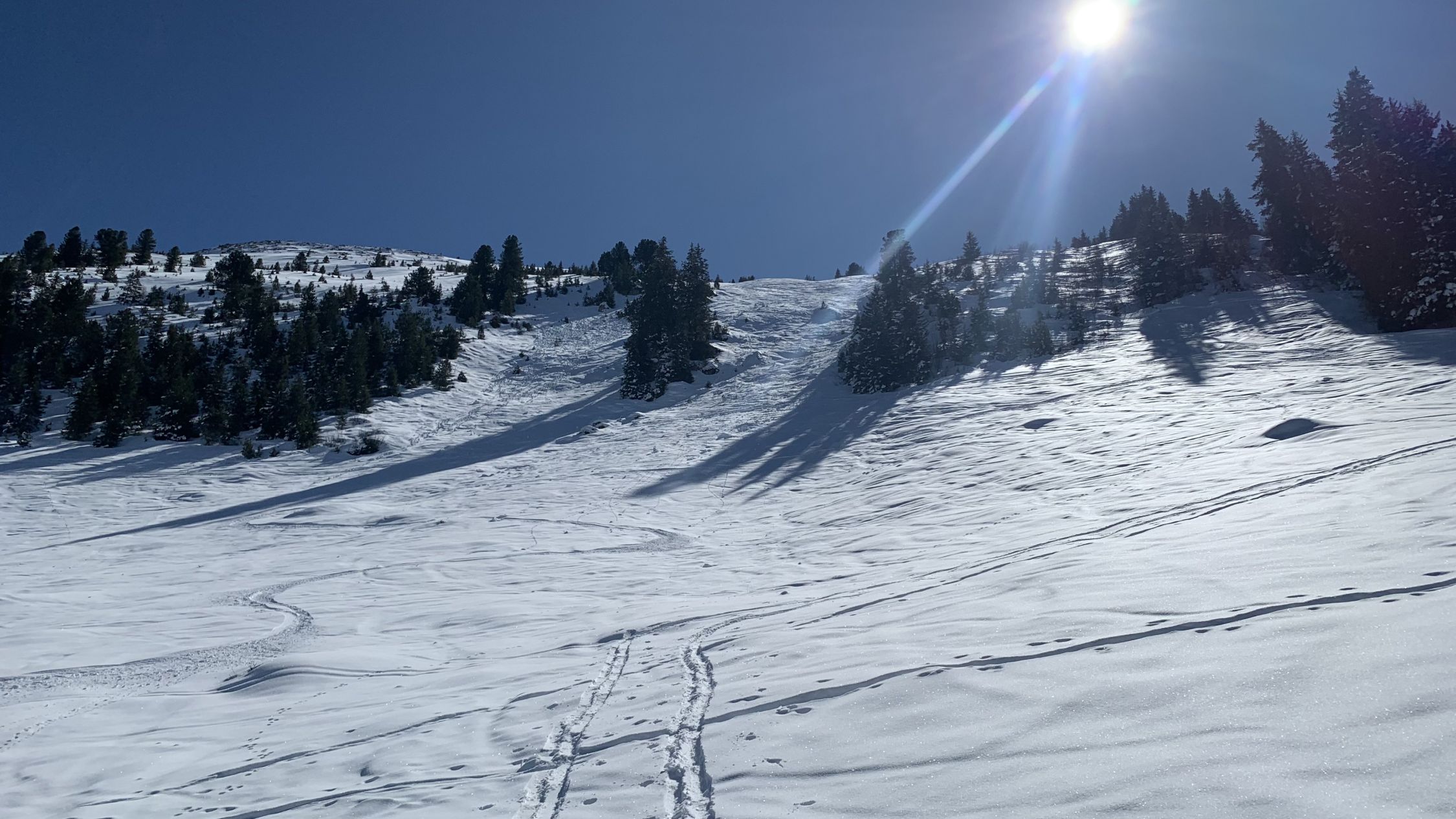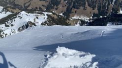 Im Steilhang Richtung Homad gut zu fahrender Pulver; am besten zurück nach Nüegg und nicht die Talabfahrt ab Homad, da dort der Schnee aufhört.
