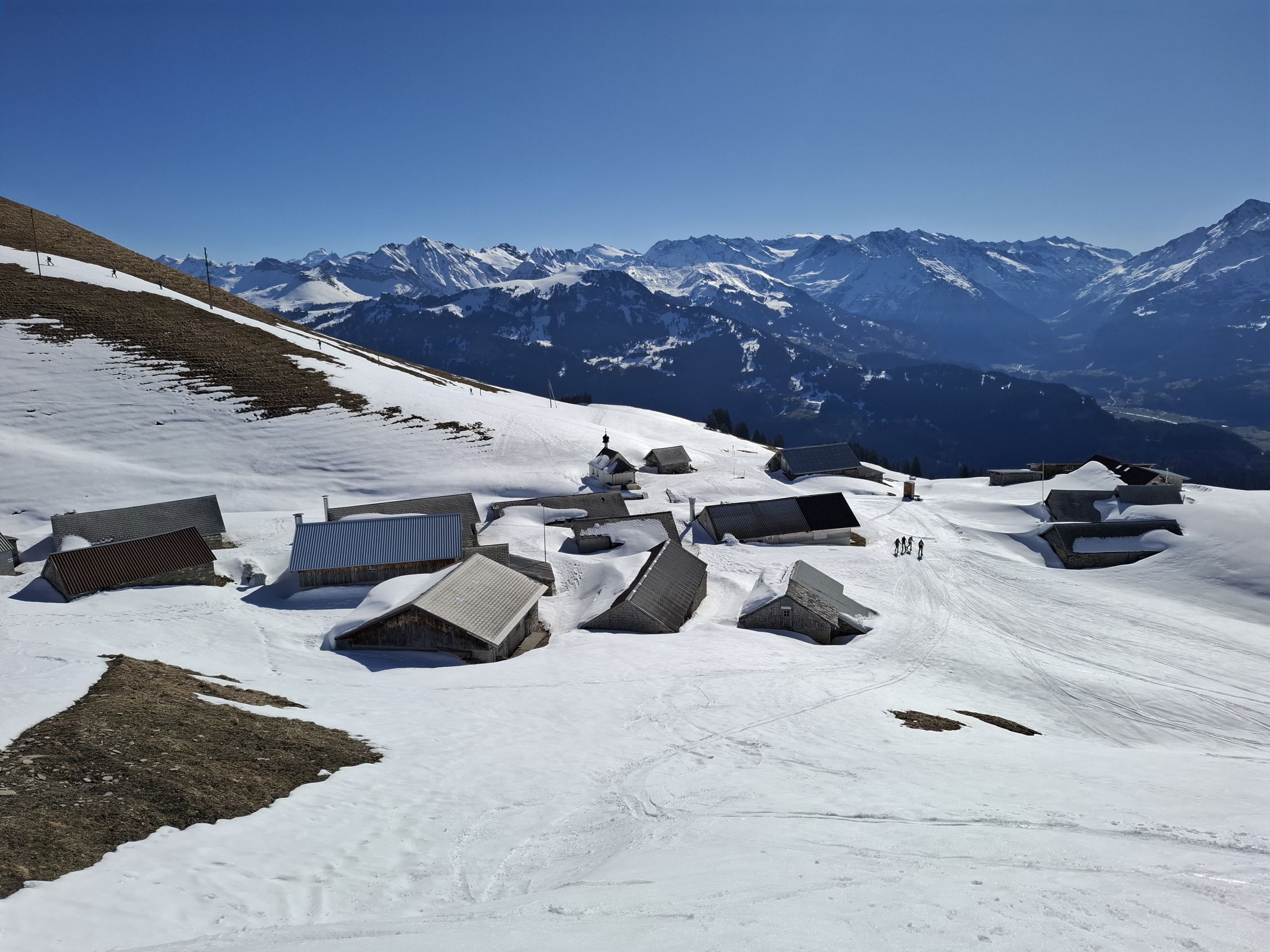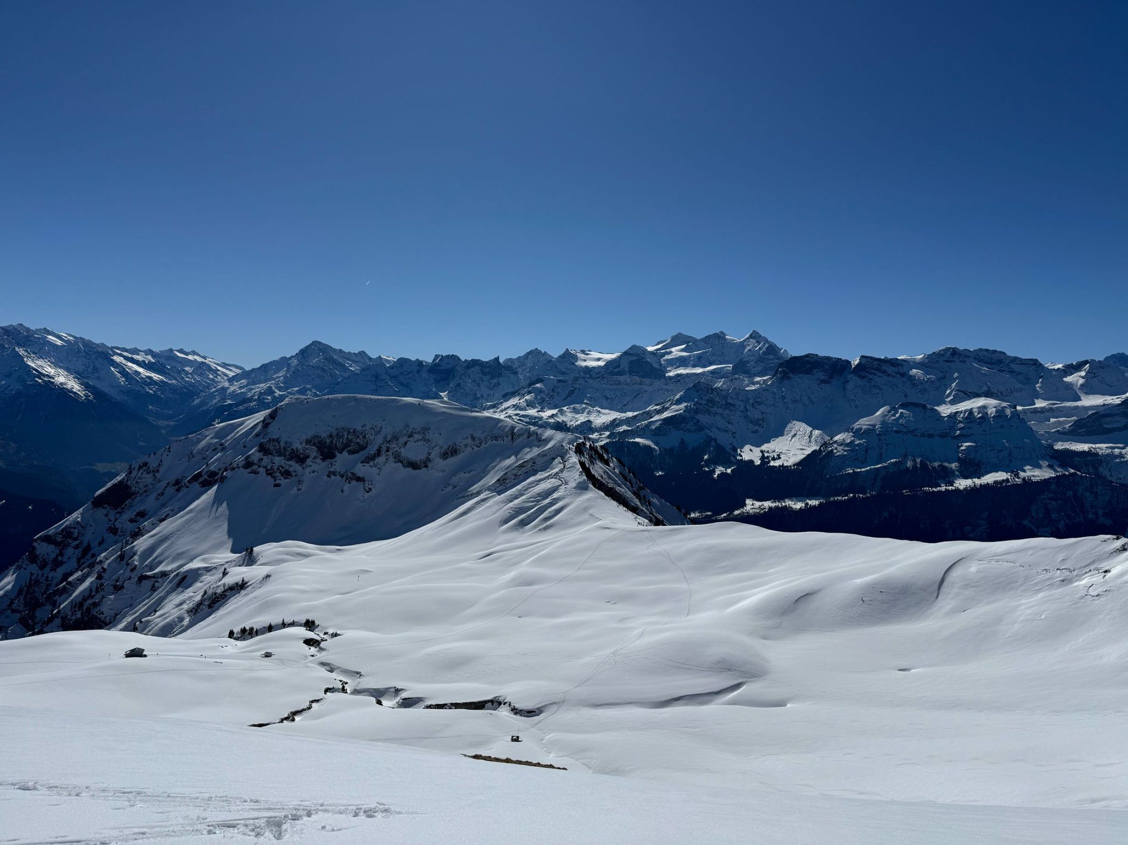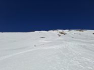 trotz Superwetter und gutem Schnee, erstaunlich wenig Leute unterwegs, bzw. sie verteilten sich gut. Für die Abfahrt durch die SO-Flanke ist ein früher Zeitpunkt angesagt. Zwei grosse Fischmäuler drohen dort schon. Wir wären für die Gipfelabfahrt zu spät dran gewesen, so gingen wir frühzeitig und rasch unter den Fischmäulern durch in den SO-Hang, von Schönbüel aus.