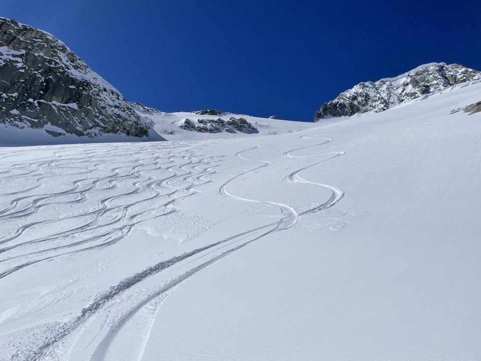 Abfahrt: Die obersten 500hm noch Pulver, dann via HotelTiefenbach, von Dort auf Passstrasse bis Hotel Galenstock. Von dort weiter via Chumme bis Realp