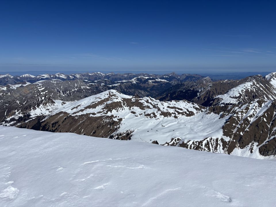 Der Gipfelblick aufs Diemtigtal fällt ernüchternd aus: Die südseitigen Hänge sind schon bis weit hoch schneefrei (siehe persönliche Fotos).