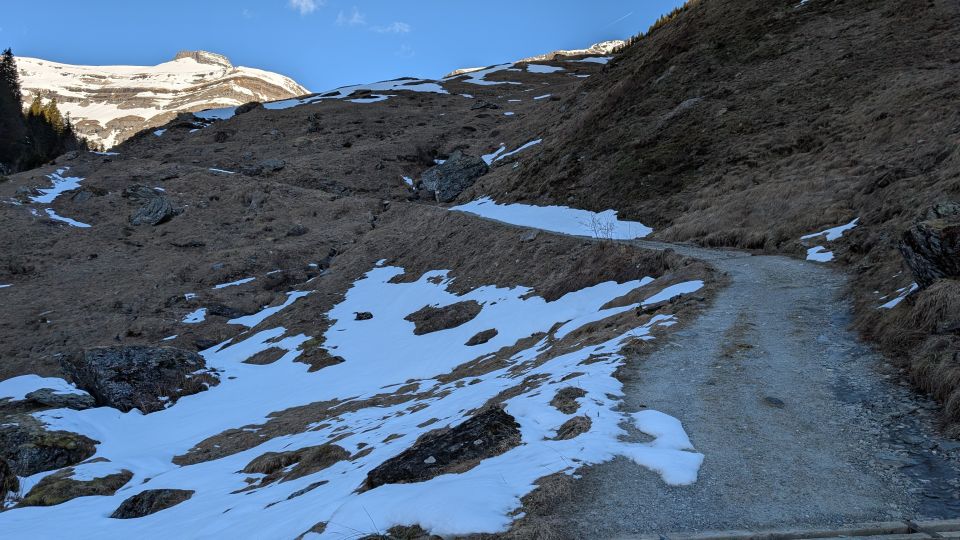 Aufstieg (Gut): Start um 07:00. Aufstieg zuerst über die Piste, dann über den Winterwanderweg. Hier einmal ca. 300m Tragestrecke. Dann im Wald ab Alp da Stiarls immer wieder kurze apere Stellen, im Aufstieg heute noch mit Ski machbar, da der Boden gefroren war. Nach Siaras nochmal eine längere Tragestrecke (ca. 400m). Dann durchgehend Schnee, zwischen 1.600 und 1.900m tragend gefroren. Bis hierher 2h.
