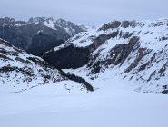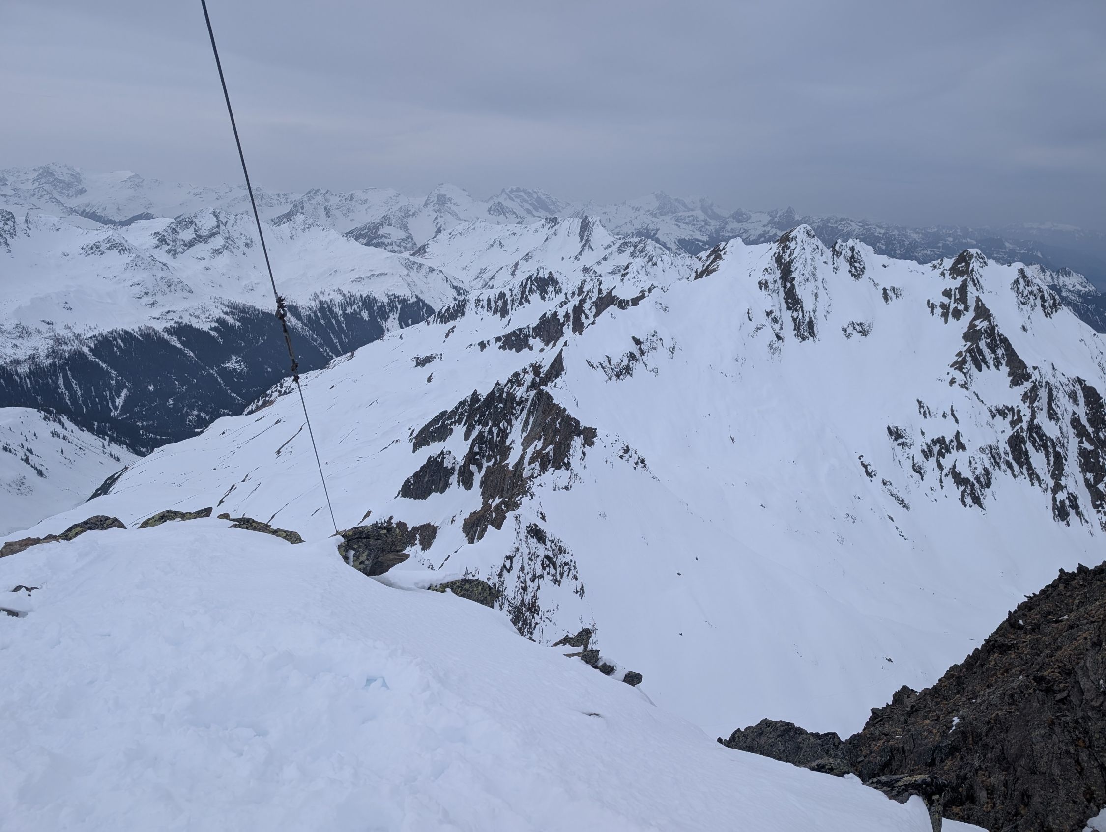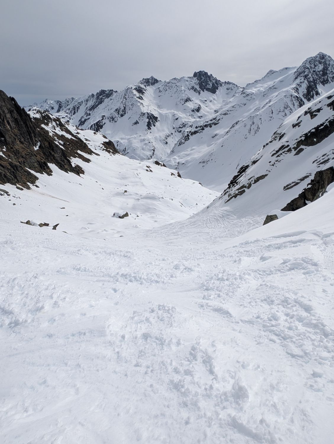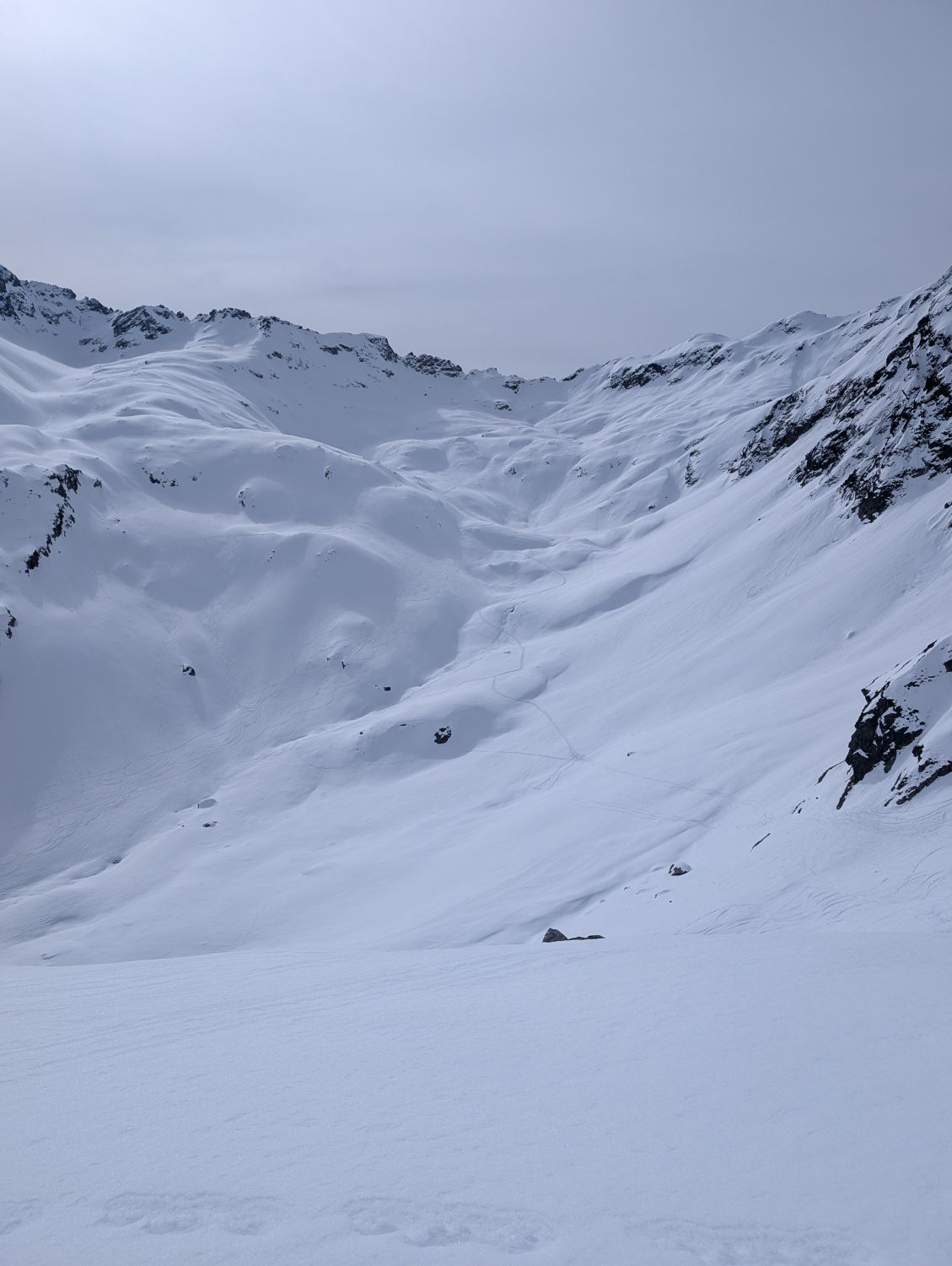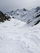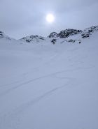 Ab 2200m schattseitig Pulver, südseitig hart bzw. tragend. Noch kaum Windeinfluss in der Schneedecke bemerkbar. Untertags auffirnend und durchfeuchtet in tiefen Lagen. Bei Querung zum Nenzinggasttal auf Nassschneebretter in und unter steilen Rinnen achten. Es hat sich zudem bereits ein ca. 30m breites Schneemaul gebildet, welches aber gut umfahren werden kann.