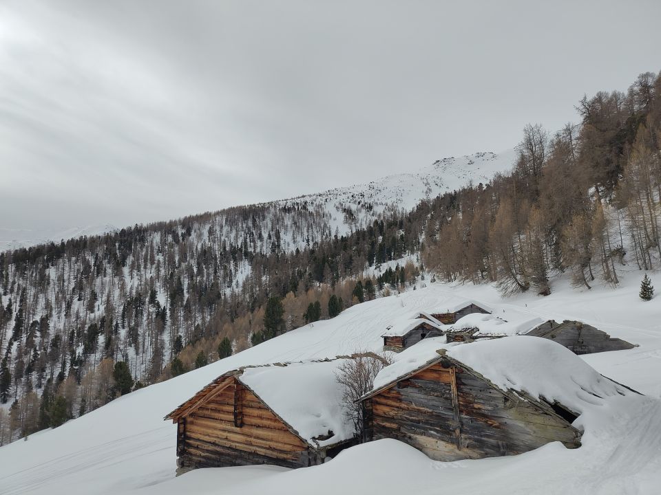 Start 7.45 in Eischoll (Bergbahnen/Pisten geschlossen seit 2 Tagen). Anfangs wars düster, doch ab 10.30 wars milchig-sonnig:-) Piste zum Aufstieg bereits morgens griffig (Nacht war nicht gefroren) Tiefschnee ab 2000 m; mit Sonneneinstrahlung in den letzten Tagen hart oder Bruchharsch, am Schatten pulver.