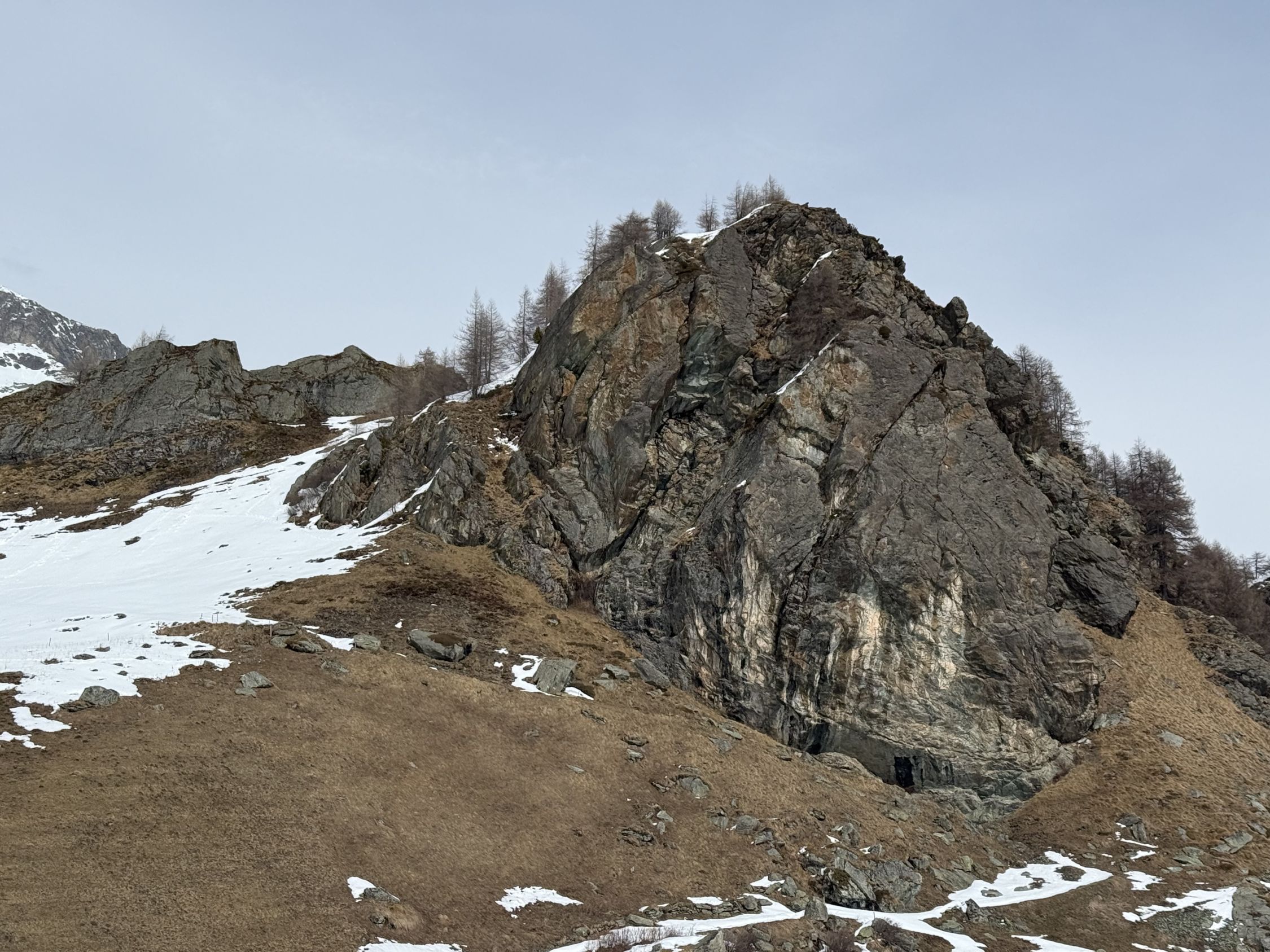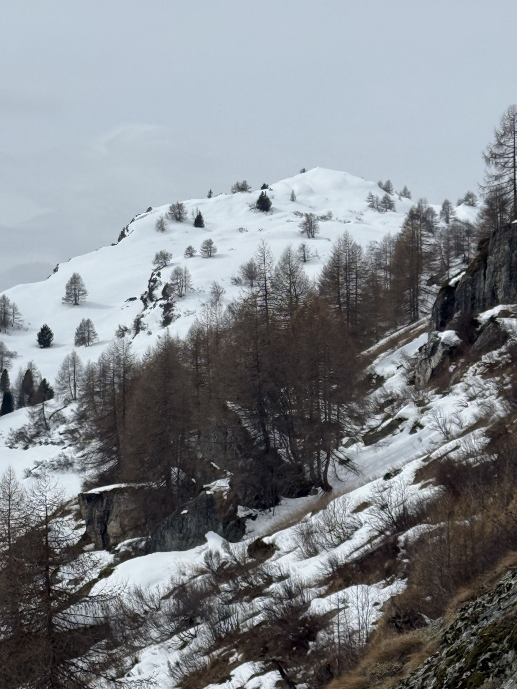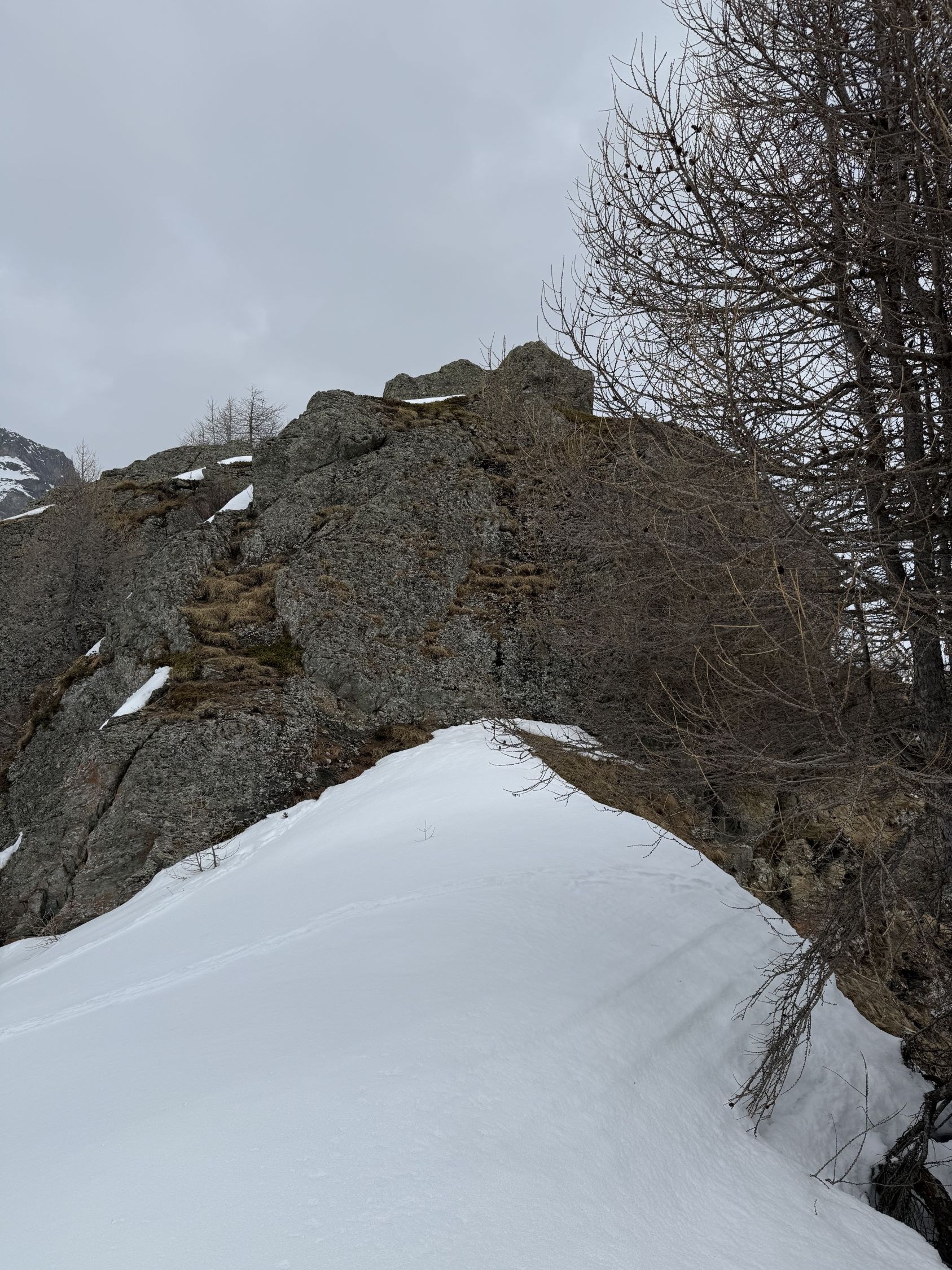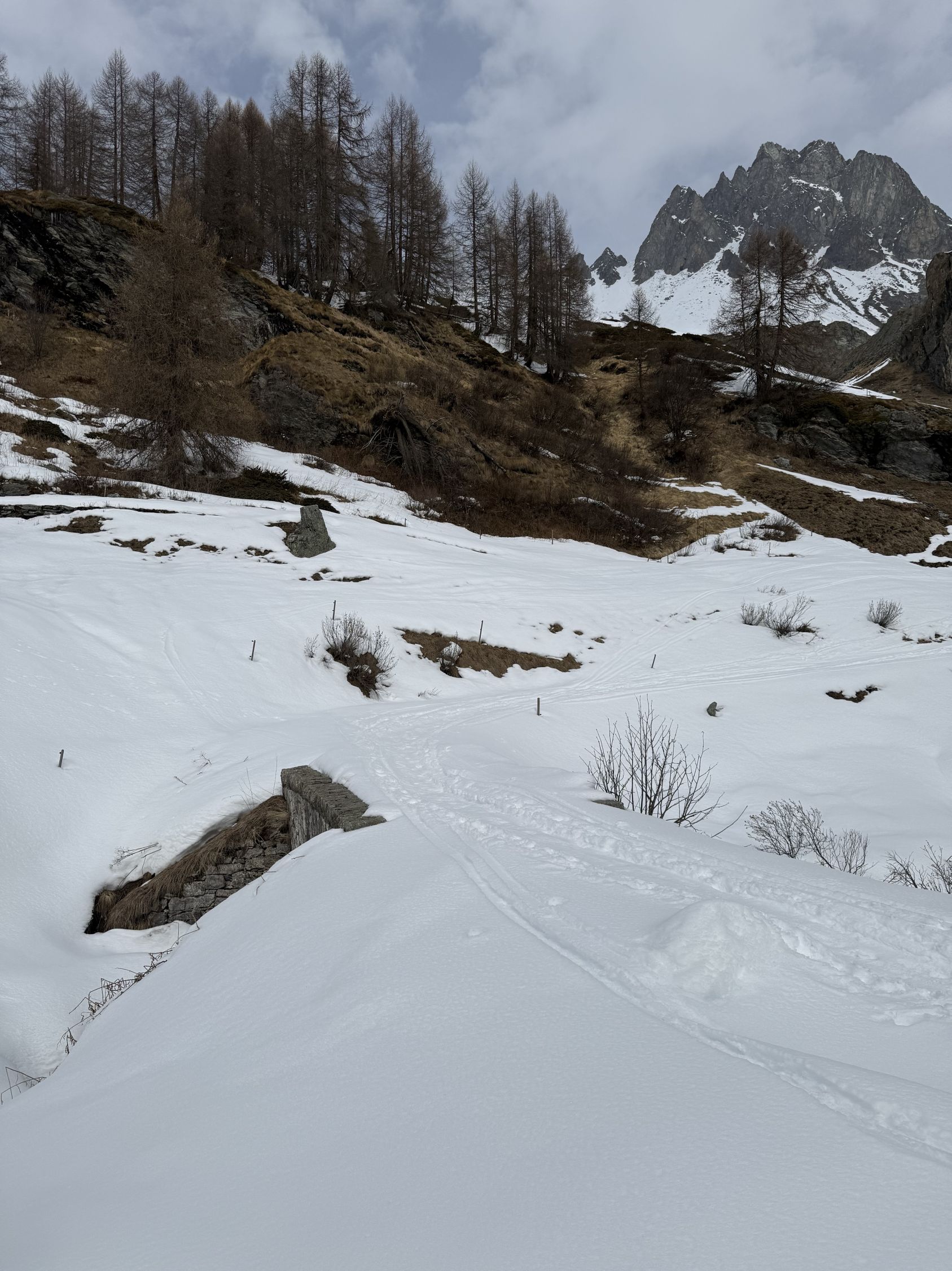 Kurze Wanderung auf den neuen Kletterpfeiler bei Grevasalvas oberhalb Silsersee, T4. Start in Plaun da Lej 10.30 Uhr, windstill, leichte Bewölkung mit Saharastaun, wenig Sonne. Bin mit Bergschuhe unterwegs, im Abstieg mit Grödel. Spur bis Grevasalvas, nachher viel Schnee, unterhalb Pfeiler aper, in der Aufstiegsflanke unten wenig, oben viel Schnee, Schneeschuhe von Vorteil. Auf dem kleinen Plateau mit steiler Kante Richtung Grevasalvas, der höchste Punkt befindet sich auf einem Felsblock, habe wegen zuviel Schnee verzichtet, von Westen sehr steil, von Osten besser. Abstieg wie Aufstieg. In der steilen Flanke befinden sich einige Fixseile mit eingehängten Expressschlingen. Vielleicht sind die Kletterrouten noch nicht fertig gebort?
