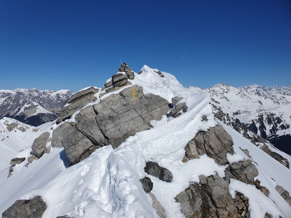 Ab dem Lift eine gute Spur, zuerst flach, dann leicht steiler und zuletzt ziemlich steil hoch zum Piz Vallatscha. Skidepot auf dem Sattel kurz nach der ausgebleichten Tafel des Nationalparks. Der Grat ist wunderprächtig eingeschneit, so, dass der Hauptgipfel sehr leicht (ohne Steigeisen) erreicht werden kann.
