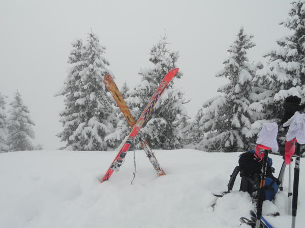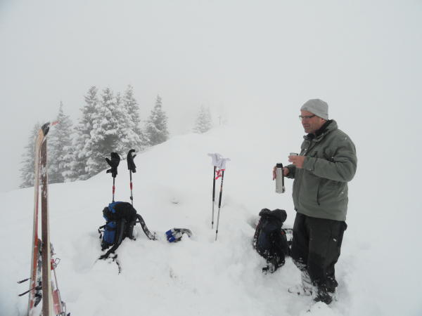Schade, das einer von uns zwei bei der Auswahl der alten Skis so alte erwischt hat, dass bei einem der Fersenautomat fehlte. Daher eine Person Skitour und eine Person alpine Wanderung bei winterlichen Verhältnissen.