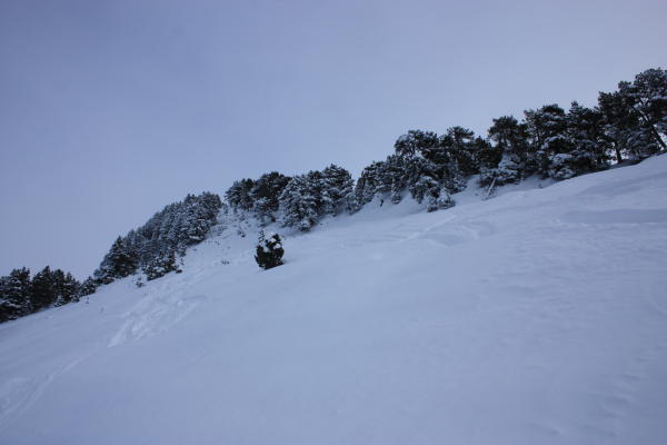 Keine Lawinen oder Schneerutsche beobachtet. Pulverschnee (von 20 {am Start} bis 40 cm {am Gipfel}) ohne Grundlage. Wenige Steinkontakte bei geeigneter Routenwahl für die Abfahrt.