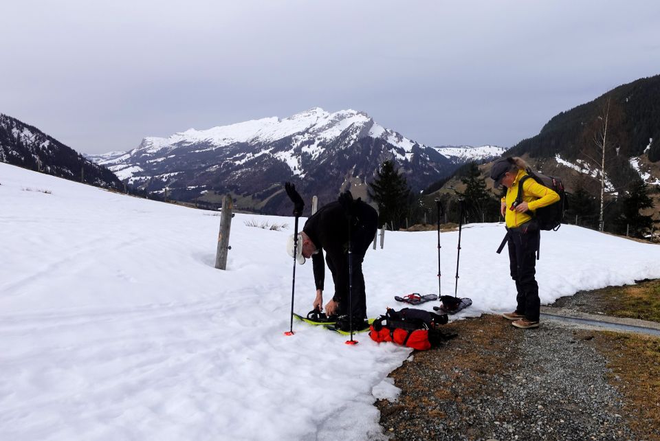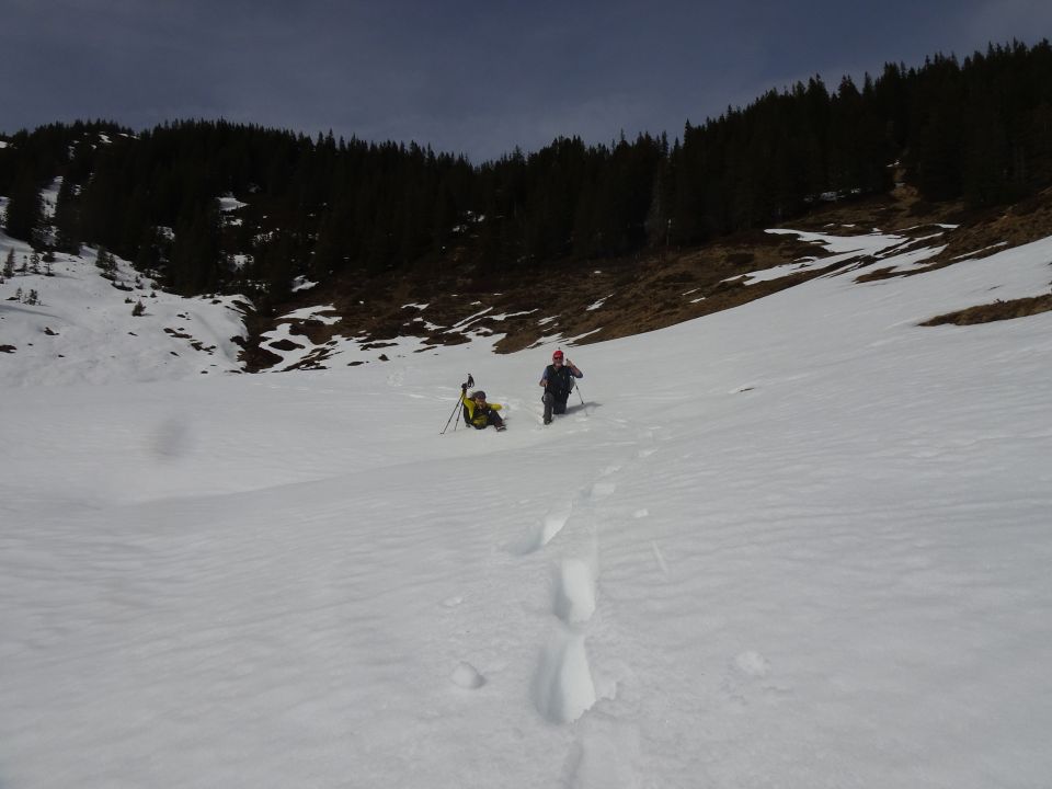 Wie vorausgesagt, trübte der Saharastaub den Himmel etwas, die Weitsicht war aber trotzdem ganz gut. Vom Föhn war fast nichts zu spüren. Der Schnee war beim Abmarsch um ca. 10 Uhr schon ziemlich weich. Auf einer Höhe von 1447m konnten die Schneeschuhe montiert werden. Entlang des Aufstieges, bis etwa unterhalb der Alp Fürstein (1651m), gab es einige apere Stellen. Mit Schneeschuhen kein Problem, Skis müssten jedoch abgeschnallt werden. Von ca. 1723m stiegen wir zum Ostgrat hoch, der, teilweise ziemlich steil, direkt zum Gipfel führt. Der Abstieg, mehr oder weniger entlang der Skiabfahrtsroute, gestaltete sich unterhaltsam. Steil geht's runter und der Schnee war weich und rutschig. Im Wald unwegsam und mit einigen aperen Flächen. Nach der Alp Fürstein trafen wir wieder auf den Aufstiegsweg.