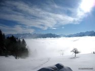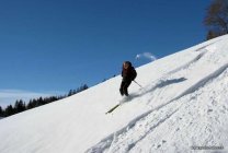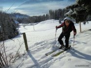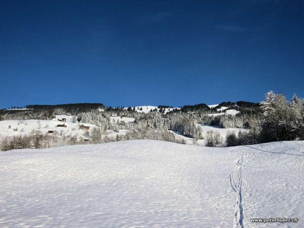 Am Start hat es ca. 10 cm Schnee auf dem Gras, weiter oben sind es 30 - 40 cm schöner Pulverschnee. Oben etwas verblasen. Bei der Abfahrt kommt man oft! auf den Untergrund, zum Glück meist Gras. Recht unruhige Unterlage zum abfahren.