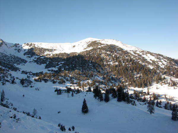 Ausreichend Schnee für eine schöne Skitour. Der Gipfelbereich ist etwas abgeblasen, dort muss vorsichtig abgefahren werden (gefrorene Grasbüschel und Steine).