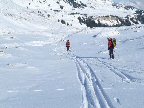 In der Ebene Laufböden noch etwas wenig Schnee, aber mit etwas Voraussicht gute Fahrverhältnisse ohne Steinkontakt. Die Grasbüschel stören ja nicht! Vom Wissmilen direkt den Nordhang runter - Traumverhältnisse -Powder vom Feinsten! Nur wenig Leute, trotz Beitrag in den "Alpen"...hei Leute, es ist SUPER!