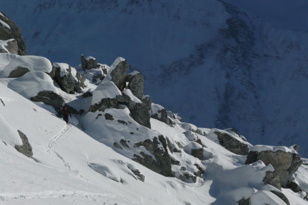 Der Fussaufstieg ist momentan etwas mit Vorsicht zu geniessen. Es liegt noch nicht so viel Schnee in den Felsen. Somit gibt es 2 Felsstellen. Gleich zu Beginn und eine längere kurz vor dem Erreichen des Grates. Steigeisen und Pickel bei den momentanen Verhältnissen sehr zu empfehlen. Der Schnee ist zudem auch noch locker - nicht wirklich Trittschnee sondern wühlen.