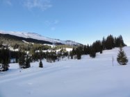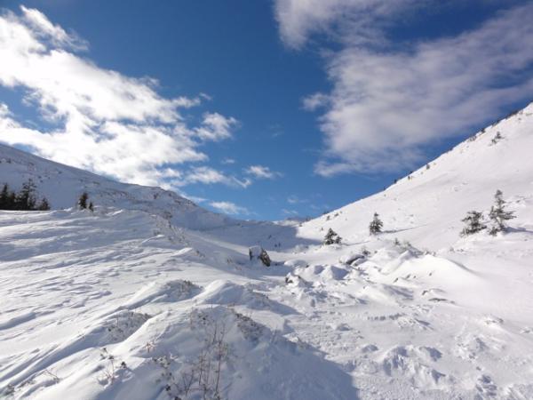 Sehr dünne Schneeschicht, oft bis auf den Boden abgeblasen, in Mulden Triebschnee.