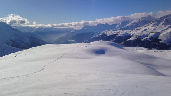 bis 1500m schöne Frühlingsverhältnisse, bis 1900 leicht gedeckelt oberhalb recht schöner z.T. windgepresster Pulverschnee. Keine Spuren. Ein einziger anderer Tourenfahrer unterwegs!