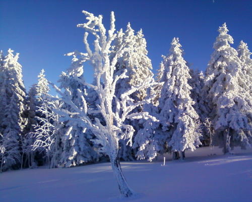 Kalt und klar. Mit Neuschnee vom Sonntag, der kaum verblasen ist. Nun auch am Stollenbach genug Schnee - kein Bodenkontakt mehr.