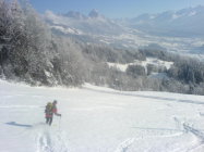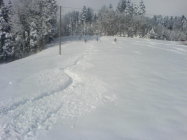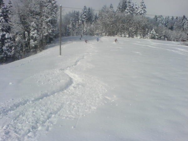 Pulver gut, ein Traum. Unten 20 cm, oben 40 cm Pulverschnee ohne Unterlage. Unten sind die Maushaufen noch nicht gefroren. Oben leichte Berührungen mit dem Grund. Macht aber nichts, da Wiese.