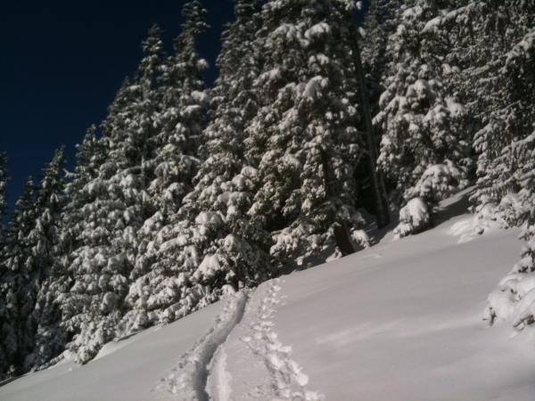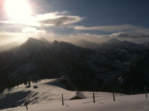 Unten sehr knapp Schnee - in Bern hat es def. mehr Schnee... ab ca. 1600m deutlich mehr Schnee, aber auch hier - ausgenommen im Gipfelhang - kaum eine echte Unterlage! Trotzdem: Super Pulver. Morgen wohl teilweise Kruste. Kalt mit starkem SW- Wind, der die Kaltluft aus den Tälern und von den Gipfeln trieb.