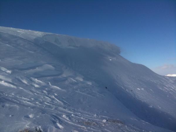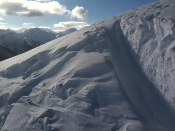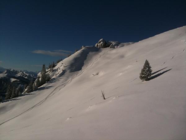 Schneebrett in der Nähe des Bauernhauses auf 1800m. Anriss >1m (Triebschnee!)