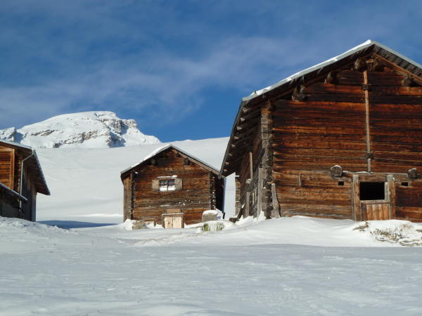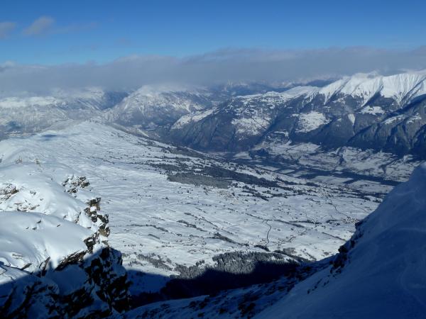 Schnee: von allem etwas, Powder, oft aber auch Windharsch. Die Rücken sind oft abgeblasen. Im Steilhang zum Beverin Pintg und von der Leiter bis zum Gipfel braucht es eine geschickte Routenwahl, um Steinkontakte zu vermeiden.