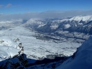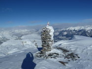 Allein unterwegs auf weiter Flur. Minus 22 Grad auf dem Gipfel plus eisiger Wind. Harscheisen sind nützlich im Aufstieg zum Pintg und in den Gipfelhängen (zum Teil glasige Oberfläche).