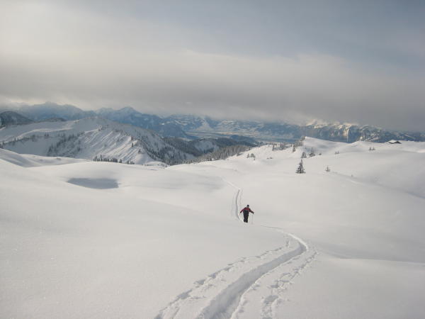 Zu viel Pulverschnee. Da das Gelände zumeist wenig steil ist, war es leider zu viel des Guten. Die Abfahrt war meist nur in der Aufstiegsspur möglich, da man sonst kaum vorwärts kommt.