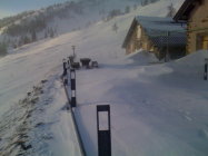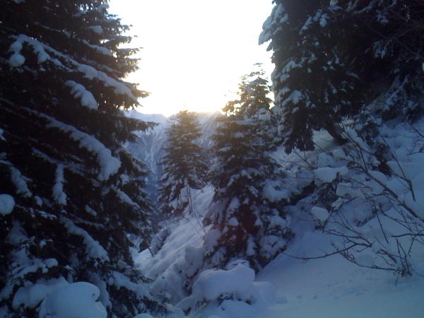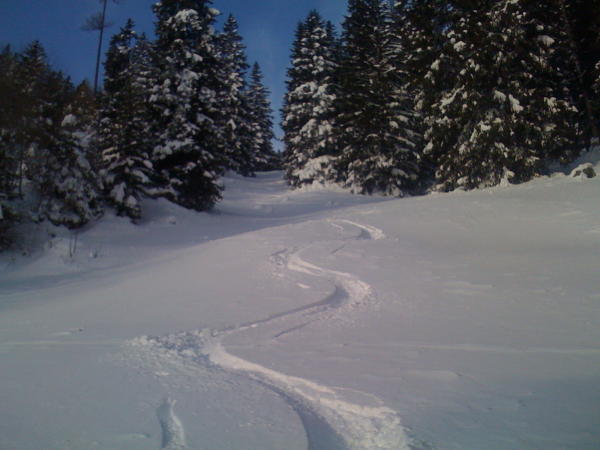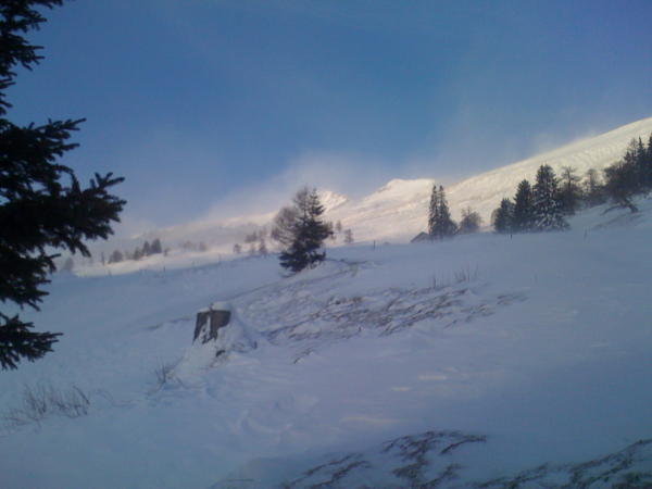 Vom Tal bis zur Waldgrenze ca. 10 - 20 cm perfekten Pulverschnee. Ab dort ein Bild des Grauens, komplett leergefegt. Die Seite ist praktisch mehr grün / braun, als weiss. Das bisschen weiss, welches geblieben ist, ist extrem geladen, es sieht beängstigend aus. Deshalb habe ich mich bei der Mastrilser Alp zur Umkehr entschlossen, denn infolge des extrem heftigen Föhnsturmes ist das gehen oberhalb der Waldgrenze nicht wirklich ein Vergnügen.
