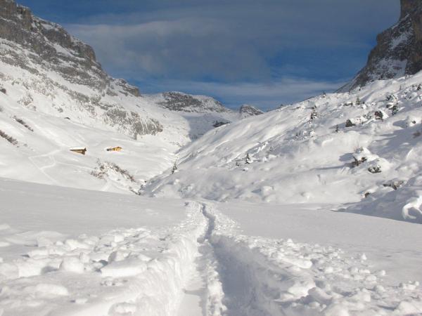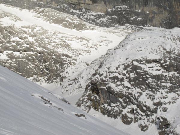 Ab Parplatz 5 bis nach Partnun erstaunlicherweise windstill. Kurz nach Pt.1801 kam dann der Föhn, sehr stark, mit Windverfrachtungen. Das Couloir sah auch nicht einladend aus, und die Gruppe vor mir die Richtung Sulzfluh stieg kehrte schon früher um. So lies ich es und kehre in halber Höhe des Nordosthangs um, er schien mir zu geladen. Ich begnügte mich mit Pt.2191 und einer passablen Abfahrt.