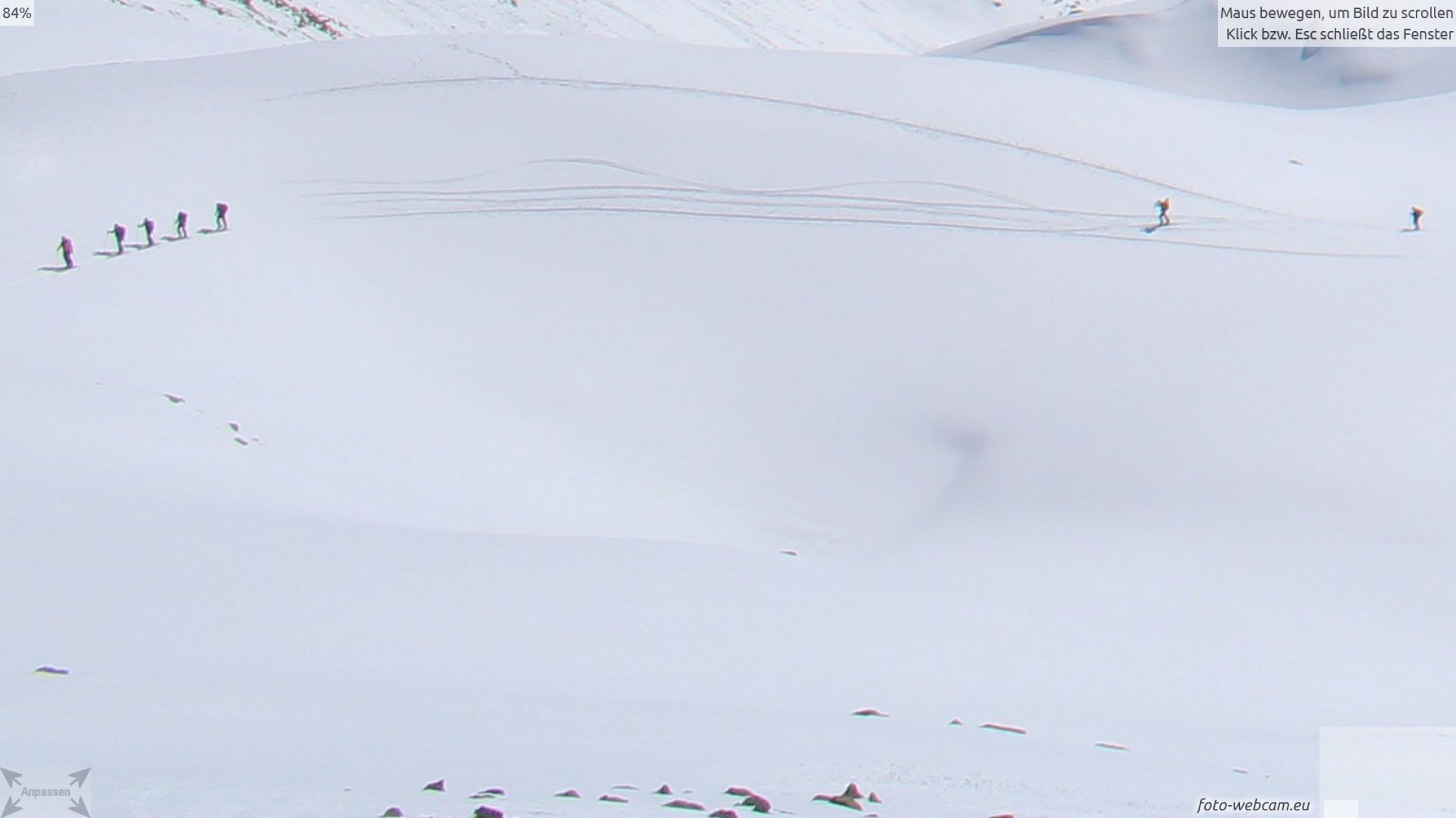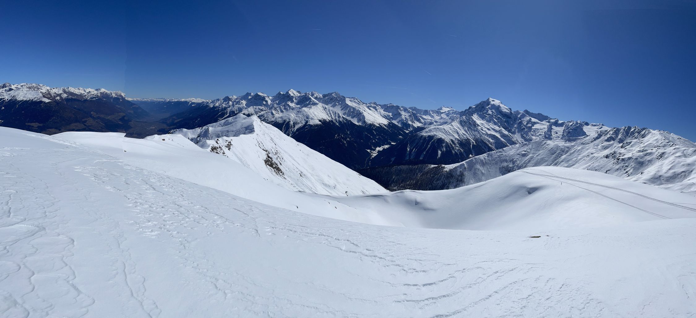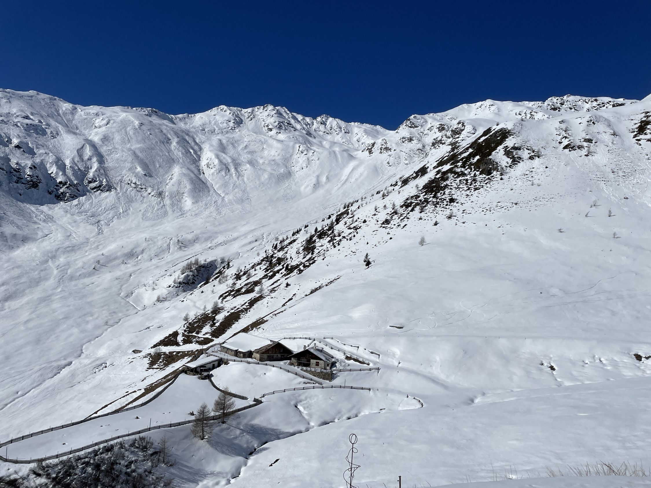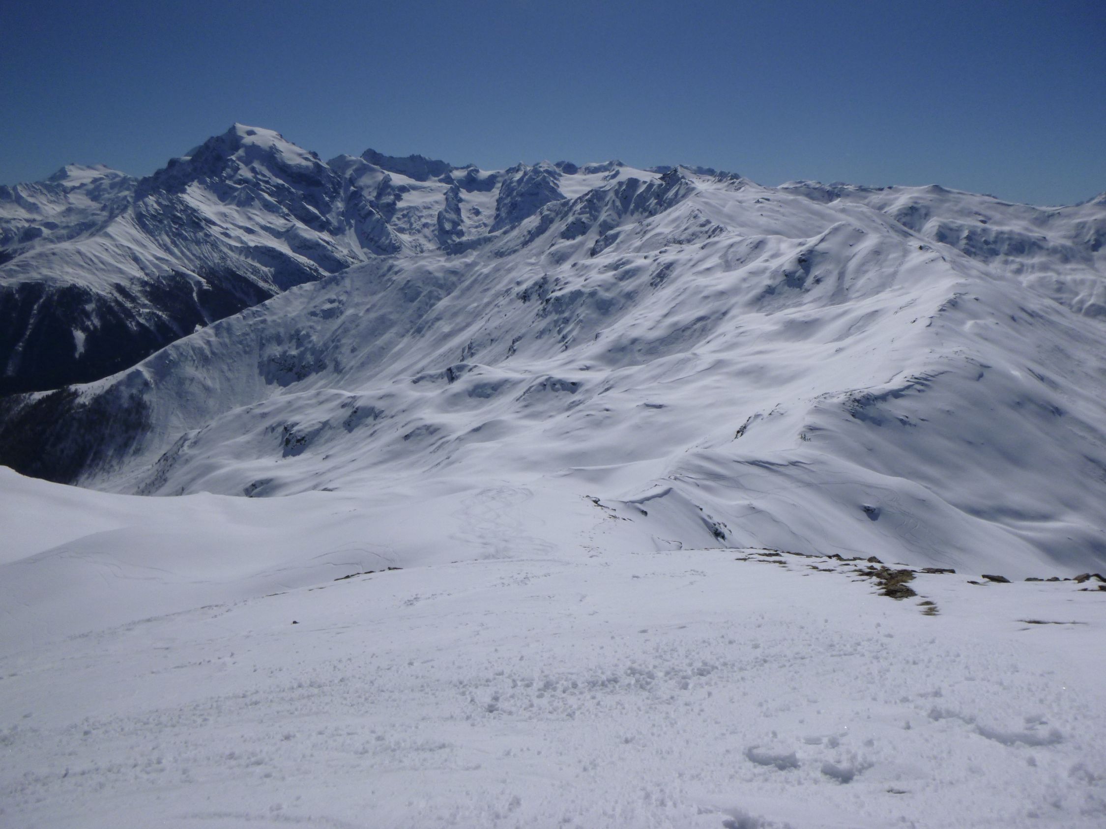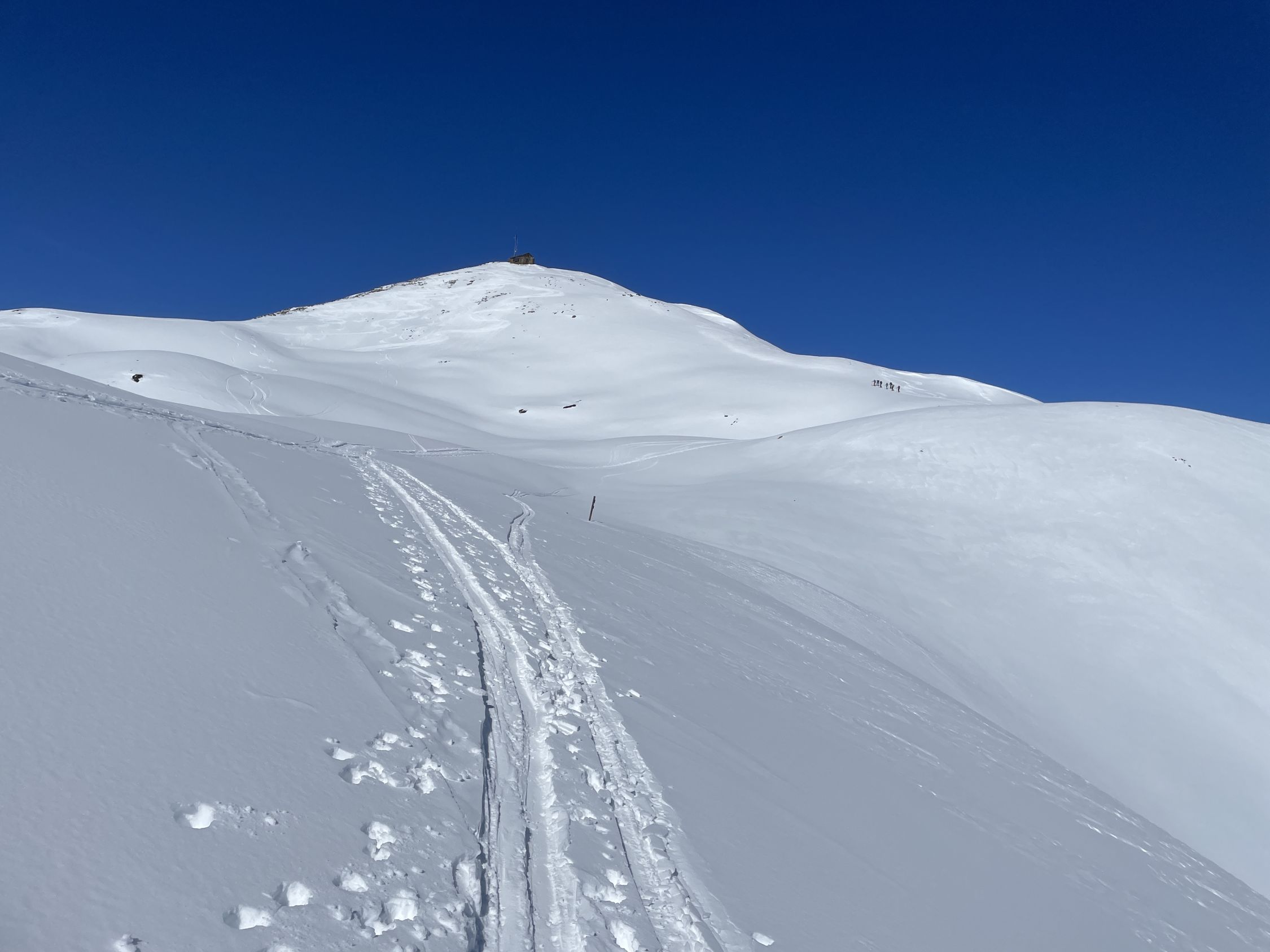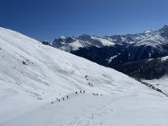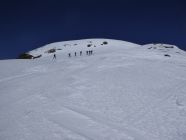 Kurz unterhalb vom Gipfel überholte mich eine Gruppe von 8 Skitourenläufern, die dann nach La Scharta abfuhren und über den südlichen Kamm zum Piz Sielva liefen. Im Abstieg überholten sie mich wieder an der Unteren Stilfser Alm. Nach mir folgte noch eine Skitourengruppe von 7 Leuten. Im Abstieg kam mir unterhalb des Gipfels ein Pärchen mit Schneeschuhen entgegen.