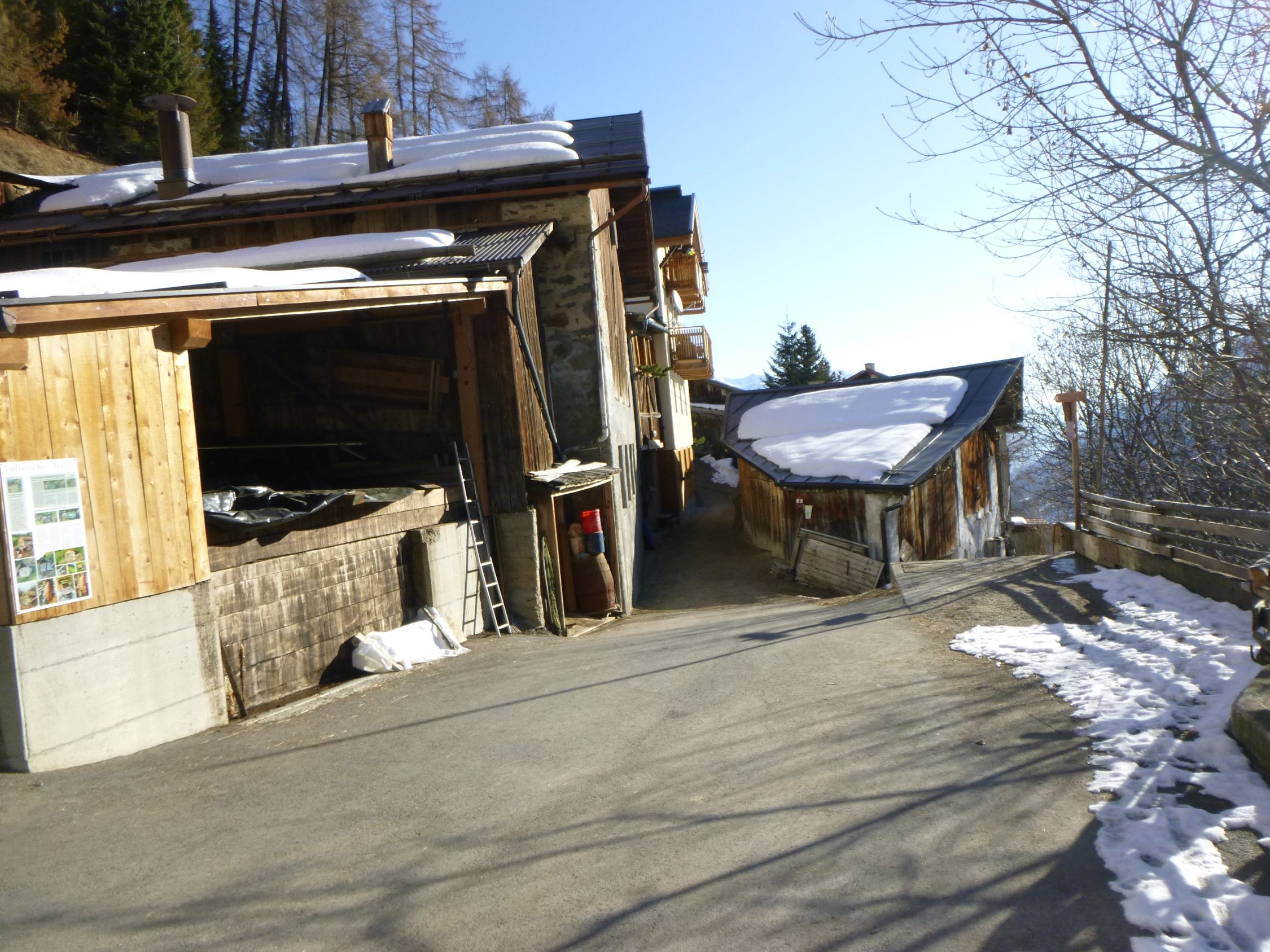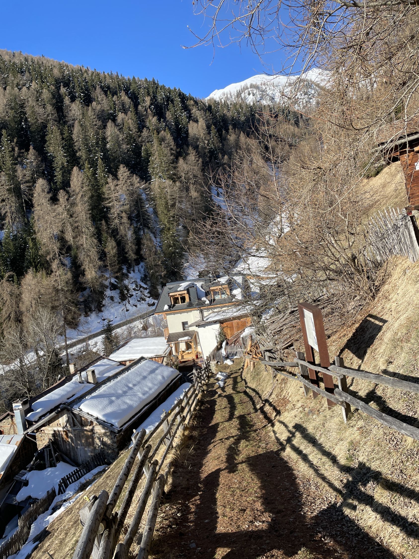Tourenbeginn um 08:10 Uhr bei -2°C unter klarem Himmel. Schneeschuhe am Ende des Waldes unterhalb der Almen angeschnallt.