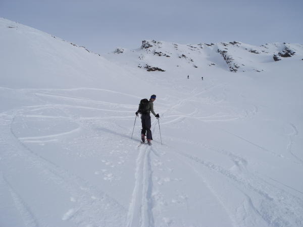 Beim Aufstieg noch schöner Pulver, bei der Abfahrt schon etwas Bruchharst. Gipfelhang verblasen und hart.