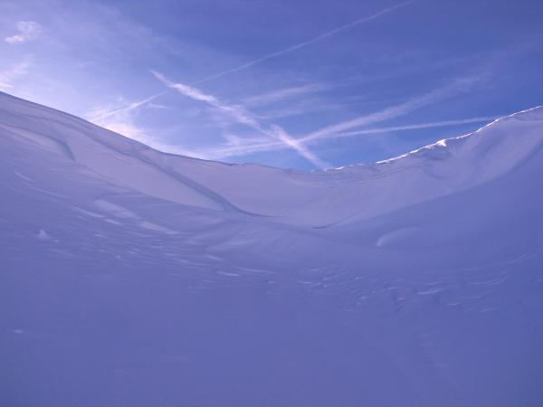 Der Wind hat volle Arbeit geleistet. Es hat doch einige Windverfrachtungen mit heimtückischen Deckel. Bei der Grimmifurggi hat es eine bachtliche aber schöne Wächte von ca. 3m Höhe gegeben.