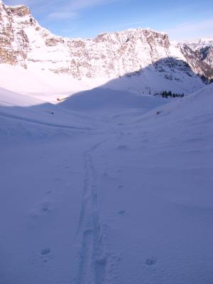 Bis zum Waldweg ist der Schnee nach wie vor Mangelware. Ab Grimmialp hat es ca. 10cm Neuschnee mit Deckel...:-(
