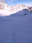 Auf der Rauflischulter hat es zum Teil recht schönen Pulver gehabt, jedoch musste ich auf der zum Teil dünnen und verblasenen Unterlage einige Stone Treffer hinnehmen. Die Abfahrt ab Grimmifurggi war nicht gerade der Hammer...Windgepresster Schnee mit Deckel.