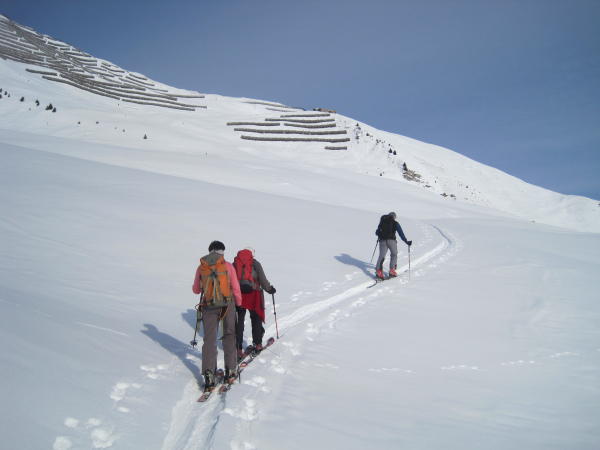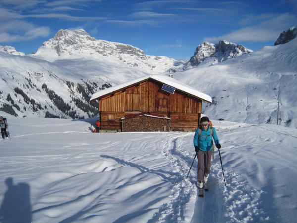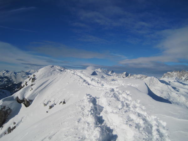 Nach der Anreise durch das Prättigau bestiegen wir als erstes von Sankt Antönien Platz (1'459 m) aus das Chüenihorn (2'413 m). Anfänglich war das Himmel strahlend blau, doch während dem dreistündigen Aufstieg zogen die ersten Wolken auf. Der Weg führte uns zuerst der Strasse entlang und dann vorbei an der Lawinenverbauung. Der Schnee war schwer und die Abfahrt kostete uns fast so viel Kraft wie der Aufstieg.