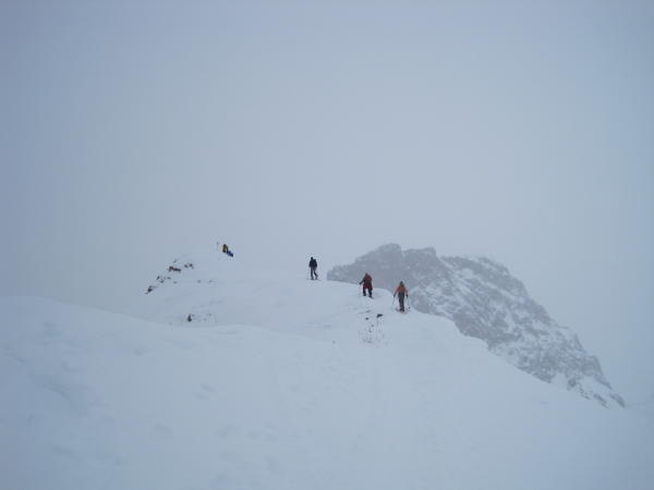 Gross war die Freude, als wir am Morgen des dritten Tages sahen, dass es doch einige Zentimeter Neuschnee hatte und die Wolken weniger dicht waren. Wir wählten den Eggberg (2'202 m) als Tagesziel und fanden einen bereits ausgetretenen Pfad durch den Wald und weiter oben über baumlose Hänge, welche die Vorfreude auf die Abfahrt immer grösser werden liessen. Der Eggberg hat zwei Gipfel und da wir uns nicht entscheiden konnten, welchen wir davon besteigen, teilten wir unsere Gruppe, Stefan und Daniel bestiegen den weniger hohen Gipfel und Bruno führte Lisbeth, Anita und Doris auf den echten und zugleich höheren Gipfel. Der Eggberg ist somit einer der wenigen Gipfel, auf dem wir kein Gruppenfoto machen konnten.