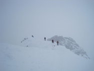Ausgeruht und vom Frühstücksbuffet gestärkt starteten wir am nächsten Morgen Richtung Schafberg. Die Sicht wurde zwar zunehmends schlechter, aber wir schafften es in 3 1/2 Stunden, unser Ziel zu erreichen. Am Gipfel konnten wir grad noch die Felswand der Sulzfluh erkennen, aber der Panoramablick auf die restlichen Berge blieb uns versagt. Wir hielten uns auch nicht lange am Gipfel auf und fuhren zügig zurück ins Hotel Büel . Als es zu Schneien begann, waren wir bereits wieder an der Wärme.