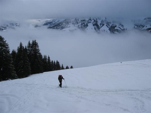 Ausreichend Schnee von unten bis oben und wieder zurück. Nur im steileren Hang oberhalb der Buchelalpe ist an einigen Stellen der Schnee schon weggeschoben. Schnee wurde heute durch Nieselregen und +1° zu mittelschwerem Pulver.