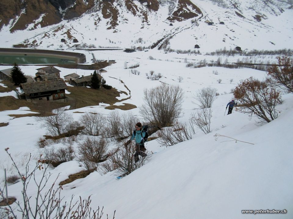 Abfahrt: Bei passabler Sicht abgefahren. Oben trug der Schnee in den flachen Passagen. Dort schön zu fahren. In den steileren Hängen sanken wir ein. Nicht so toll. Mit Geschick und Kraft einigermassen fahrbar.