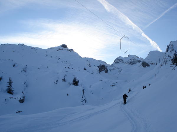 Dank dem nicht besonders guten Wetter am Mittwoch und dem Neuschnee tags zuvor präsentierten sich die Hänge heute morgen jungfräulich. Es war ein Genuss, mit dem Board durch tiefen, schönen Pulverschnee zu pflügen.