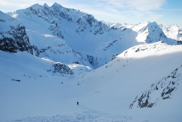 Sehr schöne Rundtour wenn es die Schnee- und Lwainenverhältnisse zulassen. Auf der Strecke begegnet man auf beiden Seiten in den untern Abschnitten mehreren Variantenfahrern aus den Pistengebieten.