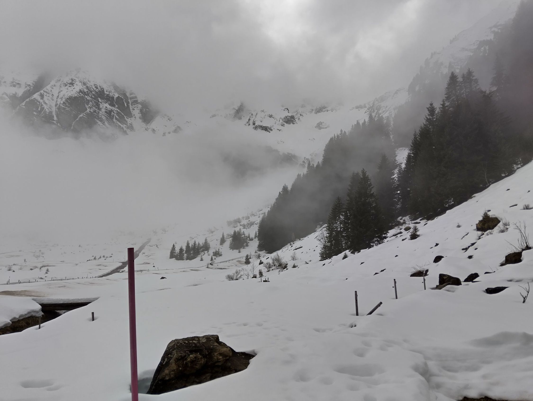 Null Sicht unten an der steilsten Stelle und viel Triebschnee.